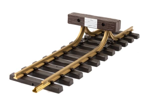 Modell eines Prellbocks mit hochgebogenen Schienen wie er bereits in der Frรผhzeit der Eisenbahn zur Sicherung von Gleisabschlรผssen verwendet wurde. Solche Prellbรถcke kann man heute noch auf Bahnhรถfen vorfinden. Nur fรผr Erwachsene.