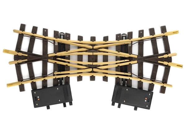 Eine Doppelkreuzungsweiche sind zwei Weichen und eine Kreuzung in einem. Gerade Gleise: 375 mm. Abzweigende Gleise: R2. Kreuzungswinkel: 22,5°. Zwei elektrische Weichenantriebe (2 x LGB 12010) liegen bei. Die Schaltung kann mit dem LGB Stellpult (LGB 51755) o.ä. erfolgen. Nur für Erwachsene.