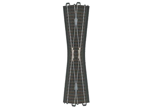 Länge 236,1 mm. Kreuzungswinkel 12,1°. Kreuzende Strecken elektrisch getrennt. An den Enden der Kreuzung werden 4 Gleise 24071 benötigt (nicht in 24740 enthalten). 2 passende Böschungskeile liegen bei. Nur für Erwachsene.
