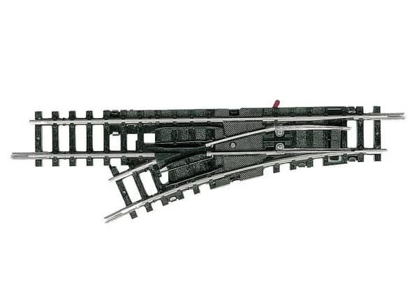 Weichen – 30°/24°.Gerades Gleis |< 104,2 mm >|. Bogenradius = R 1 – 24° bzw. mitaufgestecktem 6°-Gleis = R 1- 30°. Stopp-Weichen-Funktion wahlweise. Elektromagnetischer Antrieb kann nachträglich angebaut werden. Nur für Erwachsene.