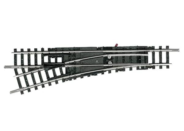 Weichen – 15° Für besonders schlanke Weichenstraßen. Gerades Gleis |< 112,6 mm >|Bogenradius = R4 -15° + 1 x 14903 Stopp-Weichen-Funktion wahlweise. Elektroantrieb ist nachrüstbar. Nur für Erwachsene.