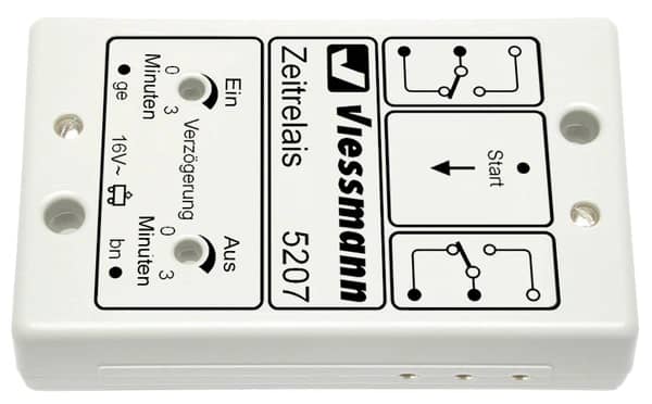 Voor tijdgestuurde handelingen, bijv. knipperende lichten, of simulatie van de reactietijd van de machinist na het op groen zetten van een sein. Vertragingen voor het in- of uitschakelen zijn afzonderlijk instelbaar tussen 0 en 3 minuten. Er zijn twee gelijktijdig schakelende uitgangen beschikbaar, zodat u het tegelijkertijd voor een sein en een trein kunt gebruiken. Max. stroom contactbelasting: 2 A per uitgang.