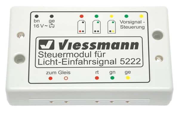 Te gebruiken voor alle 3-aspect kleurlicht inrijseinen schaal 0 tot Z (behalve seinen met multiplex-technologie). De module biedt alle 3 de aspecten van het inrijsein (Hp0, Hp1 en Hp2). Authentiek soepel schakelen van seinbeelden. Geรฏntegreerd contact voor treinbesturing. Bij stoptonend sein wordt het spoor voor het sein uitgeschakeld. Aansturing door universeel drukknoppaneel artikel 5546, enkele knop, schakelen van sporen, spoorcontacten of digitale magneetdecoder. Extra uitgang voor aansturing van verafgelegen sein door besturingsmodule item 5220.