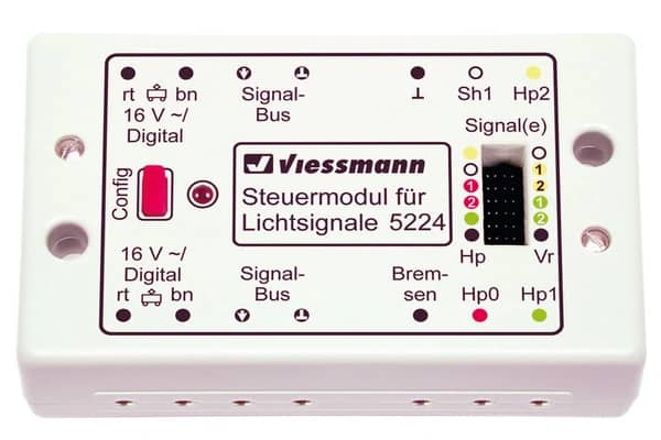 De module heeft een geïntegreerde digitale decoder (Märklin-Motorola, NMRA-DCC) en wordt gebruikt om 2 gekleurde lichtseinen (een huissein en een verweg-sein) met LED’s en een gemeenschappelijke pluspool of lampen aan te sturen, op voorwaarde dat ze in totaal niet meer dan 200 mA trekken. Daarom is hij geschikt voor alle seinschalen 0 t/m Z (behalve de Viessmann seinen met multiplex-technologie). Hij kan in conventionele modus worden geactiveerd via de drukknoppenpanelen 5545, 5546 en 5547 of via een digitaal signaal. Hij is uitgerust met Viessmann Signalbus en kan voor de volgende toepassingen geconfigureerd worden: – Een 2- of meer-voudig kleurenlichtsignaal: Een huissein met 2 aspecten met de aspecten doorgaan en stoppen vereist het drukknoppaneel item 5547 (voor 4 signalen) of een digitaal adres. Een sein met 3 of 4 aspecten met de extra aspecten langzaam doorgaan en rangeren toegestaan vereist het drukknoppaneel item 5546 (3-aspect, 2 seinen) resp. item 5545 (4-aspect, 2 seinen) resp. een digitale bediening 2-aspect. – Afstandssein of bloksein: Bij configuratie als bloksein reageert de module automatisch op de status van de betreffende spoorsector. Dit werkt alleen in combinatie met spoorbezetmelders met continue uitgang. Per seinsector zijn maximaal 2 spoorsectoren nodig. In deze modus gaat de module automatisch verder als de volgende sector vrij is (onbezet). Als één van de twee sectoren bezet is, schakelt de module naar stop. – Eigen verwegsein of verwegsein op dezelfde mast: De seinmodule bedient het hoofdsein en het bijbehorende verre sein of het verre sein van een volgend hoofdsein dat op dezelfde mast gemonteerd is. In dat geval toont het verre sein het donkere aspect als het hoofdsein stop toont. – Onderbreek de voeding van het spoor of schakel de remgenerator in wanneer stop wordt getoond: Met het relais voor automatische treinbesturing item 5228 kan de module treinen automatisch tot stilstand brengen door de spoorspanning voor het sein te onderbreken of – meer prototypisch – met de digitale remmodule item 5232 (Märklin Motorola) of een remgenerator (voor NMRA DCC). Dit maakt het mogelijk om zowel in analoge als digitale modus de baan per sectie te besturen. Sein met aspecten stop en langzaam rijden: Indien gewenst kunt u de module zo instellen dat alleen deze twee aspecten toegestaan zijn. In dat geval kan de module geactiveerd worden via het drukknoppaneel item 5547 of een digitaal adres. Ongeacht of de module door drukknoppen of spoorcontacten wordt geactiveerd, de logica zorgt er altijd voor dat de rode knop voorrang heeft als twee of meer apparaten tegenstrijdige commando’s geven.