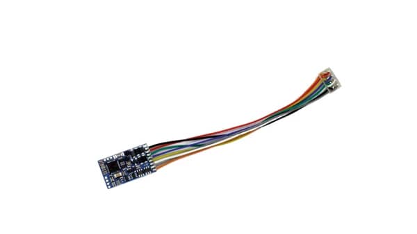 Miniatuur multi-protocol locomotiefdecoder geschikt voor RailCom, DC, DCC (2- en 4-cijferige adressen) en Mรคrklin Motorola, met automatische protocolherkenning. Instelbare minimum- en maximumsnelheden en een vrij programmeerbare snelheidsstappentabel (28 stappen), instelbare hoogfrequente lastregeling, ook geschikt voor kernloze motoren, met 14, 28 en 128 snelheidsstappen en rangeermodus. Aandrijfstroom 1 A continu, 1,8 A piek. 4 functie-uitgangen, met extra functies: Functiemapping, richtingafhankelijke koplampen, dimmen, knipperen. De maximale stroom van de functie-uitgangen is 500 mA. Alle uitgangen zijn beveiligd tegen overbelasting, bovendien is de decoder beveiligd tegen oververhitting. De decoder heeft een SUSI-interface, evenals een aansluiting voor externe energieopslag, als soldeerpads. Afmetingen: L ca. 2,4 x B 1,42 x H 0,2 cm.