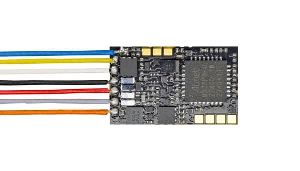 Miniatuur multi-protocol locomotiefdecoder geschikt voor RailCom, DC, DCC (2 en 4-cijferige adressen) en Märklin Motorola, met automatische protocolherkenning. Instelbare minimum- en maximumsnelheden en een vrij programmeerbare snelheidsstappentabel (28 stappen), instelbare hoogfrequente lastregeling, ook geschikt voor kernloze motoren, met 14, 28 en 128 snelheidsstappen en rangeermodus. Aandrijfstroom 0,5 A continu, 0,8 A piek. 2 functie-uitgangen voor verlichting afhankelijk van de richting, met extra functies: Functietoewijzing, dimmen, knipperen. De maximale stroom van de functie-uitgangen is 300 mA. Alle uitgangen zijn beveiligd tegen overbelasting, bovendien is de decoder beveiligd tegen oververhitting. De decoder heeft een SUSI-interface, evenals een aansluiting voor externe energieopslag, als soldeerpads. Afmetingen: ca. L 1,15 x B 0,95 x H 0,21 cm.