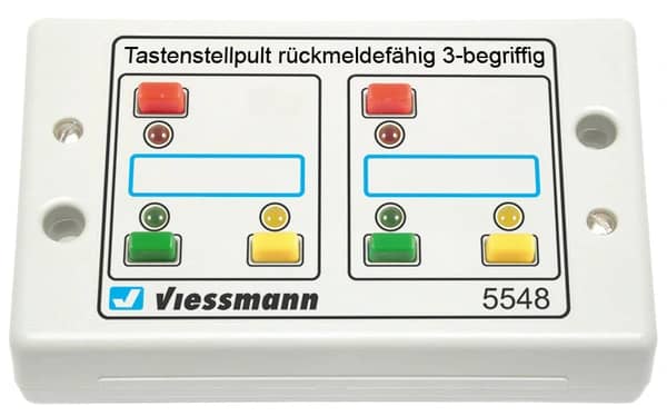 Feedback compatibel drukknoppaneel met impulscontact voor twee semafoorseinen met 3 aspecten. Authentieke terugkoppeling van de signalen door 6 rode, groene en gele LED’s. Er kunnen meerdere panelen aan elkaar gekoppeld worden. Alleen te gebruiken voor seinen met automatische deactivering via mechanische contacten. Contactbelasting: 2 A