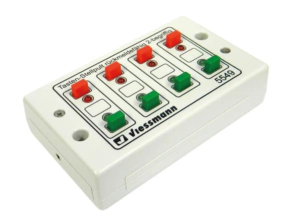 Terugmeldingscompatibel drukknoppaneel met impulscontact voor vier semafoorseinen met 2 aspecten, sporen of universeel relais, artikel 5551. Authentieke terugkoppeling van de seinen, sporen of relais door 8 rode en groene LED’s. Er kunnen meerdere panelen aan elkaar gekoppeld worden. Alleen te gebruiken voor seinen met automatische deactivering via mechanische contacten. Contactbelasting: 2 A.