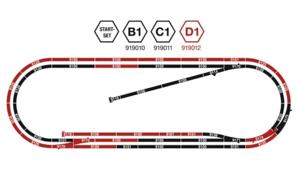 De Fleischmann 919012 Railset D1 biedt een uitgebreide set voor het uitbreiden van grotere Fleischmann N-schaal modelspoorbanen.
