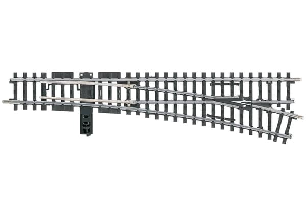 Mit abnehmbarem Handschalthebel. Festes Herzstück und Radlenker. Länge des geraden Gleises 225 mm. Weichenbogen 14° 26′. Radius des Bogens 902,4 mm. Elektromagnetischer Weichenantrieb 75491 kann angesteckt werden. Nur für Erwachsene.